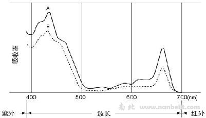 从图中可以看出,叶绿素在蓝色区域(400—500nm)和红色区域(600—700nm)范围内吸收达到了峰值,但在近红外区域却没有吸收。