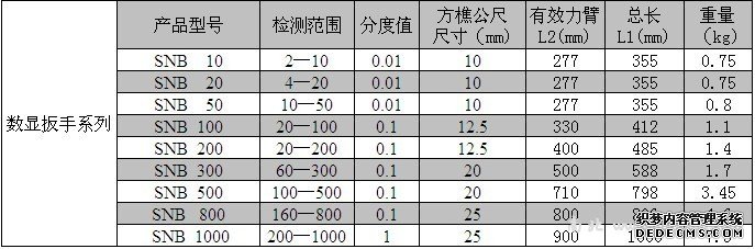 SNB100数显扭矩扳手1.SNB系列数显扭矩扳手采用微处理器数字化处理技术,核心是应变计传感器2.该产品示值、性能稳定,耗电量小,使用方便3.该系列产品具有示值跟踪,峰值保持,预制报警4.(N.M、Ibf.ft、Ibf.in)三种单位自动转换5.扳手头可更换,欠压显示,不使用3分钟自动断电等功能