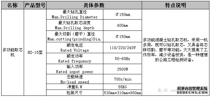 多功能取芯机 HZ-15 多功能混凝土钻孔取芯机: 1.采用一机多用,既可以钻孔取芯 2.又具备将芯样切割、磨平等功能 3.大大提高了工作效率,减少设备投资 4.是一种理想的公路工程检测设备
