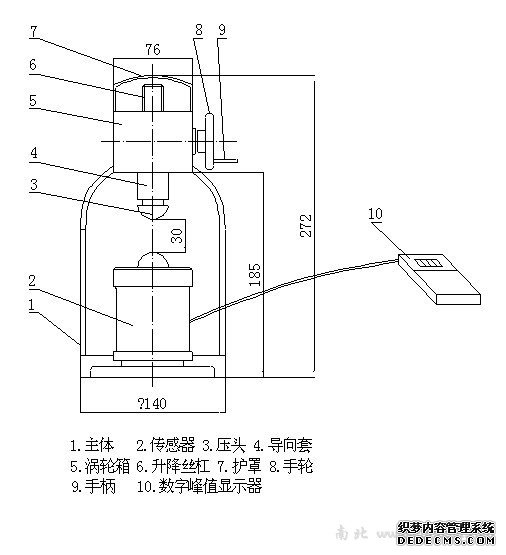 5、将砂浆试样放置在下加载头上,上、下加载头对准预先画好的作用点,用手顺时针慢慢转动点荷仪的手柄,通过蜗轮、蜗杆传动使升降丝杠向下移动,当加载头顶住砂浆试样时就产生了压力荷载,然后缓慢均匀的施加荷载,至试件破坏,此时停止加荷.