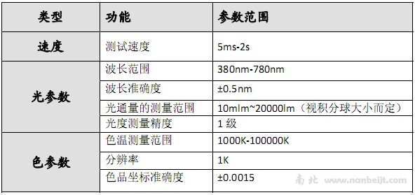 测量LED的光谱功率分布,色品坐标,相关色温,显色指数,色温差,峰值波长,光谱半宽度,主波长,色纯度,光通量,光效,正向电压,反向漏电流等光色电性能参数。