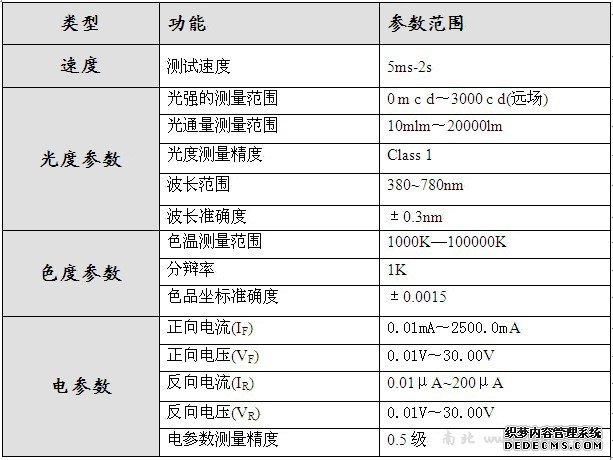 测量LED的光谱功率分布,色品坐标,相关色温,显色指数,色温差、峰值波长、光谱半宽度、主波长、色纯度、光通量、发光强度(配测试支架)、光效、正向电压、反向漏电流等光色电性能参数; 仪器智能化程度高,测试稳定性,重复性高,完全满足CIE 对光和颜色的测量要求。