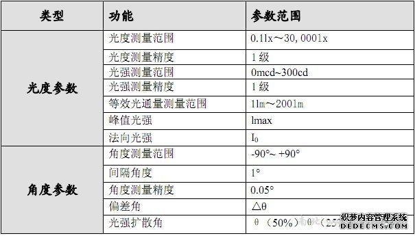 一、应用功能 用于卤钨灯、射灯、金卤灯、半导体发光器件等小型灯具的配光曲线、光强数据、光束角、等效光通量测试,测试距离可调。测试过程由计算机控制完成,操作简单,使用方便、性价比高。可配置夹具。 二、技术特性 ● 自动绘制光强曲线(极坐标或直角坐标); ● 自动测定光束角:常用的半强度角以及可以满足特殊要求的1/4强度角和3/4强度角 ● 用于测试大功率LED杯灯、射灯等小型灯具的配光曲线;