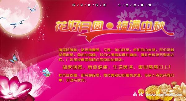 郑州南北仪器设备有限公司全体员工对社会各界人士致以真诚的节日问候!月光皎皎,月饼甜甜,月桂香香,月儿圆圆,千江月明千江水,万里花飘万里情,良辰吉日里遥寄思念,花好月圆中放飞祝福,感谢您长期以来的关心支持和爱护,敬祝您中秋快乐,合家幸福,吉祥如意,大展宏图!