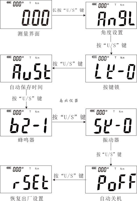 4.7.7 恢复出厂设置:用户通过此功能可使仪器恢复出厂设置。通过按“”键和“”键来选择“yes”(恢复出厂设置)或者“”(不恢复出厂设置)。若选择恢复出厂设置,选择“yes”后迅速短按“U/S”键,液晶屏随后出现“succ”(已恢复出厂设置),并且系统自动返回到测量界面。若选择不恢复出厂设置,选择“”即可。