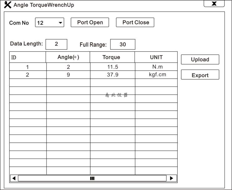 使用制造商提供的光盘,在电脑上安装好通讯软件,然后在数显扳手开机状态下用数据线连接数显扳手和电脑,双击软件图标,打开软件,先选择“Com No(端口号)”,再点击“Part Open”,然后点击“Upload”,这时表格上会出现本仪器内的存储数据,表示上位机已连接成功,已达到读取存储数据的目的。如下图所示: