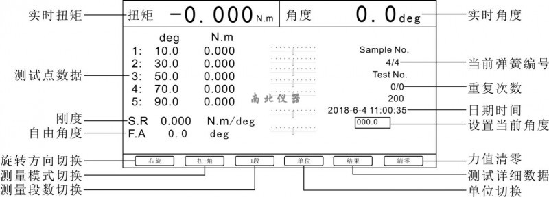 d、测量模式切换:分为扭-角与角-扭,这两个模式区别在于基准不同,扭-角是根据相应的角度来记录弹簧的扭力;角-扭是根据相应的扭力来记录弹簧的角度。