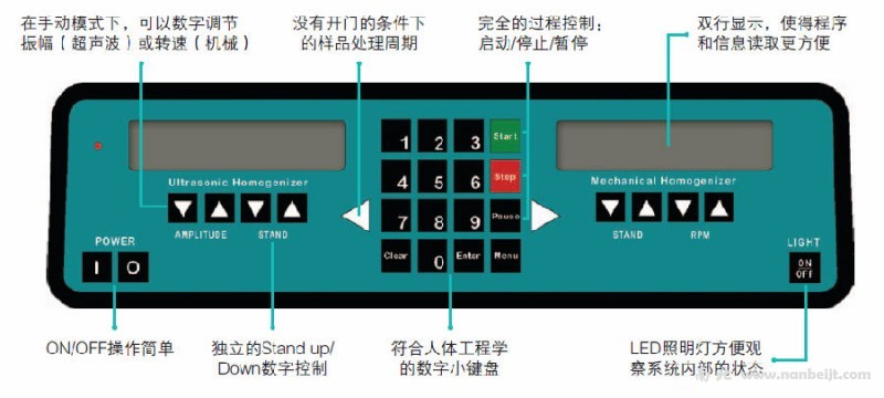 高性能的无刷电机使得机械均质能力更高,130瓦的超声波处理器保证在均质的全过程中具有恒定的振幅。降噪隔音室有一个高亮度节能LED灯为操作提供明亮的灯光,聚碳酸脂材料前门可以让实验员清楚地看到实验的全过程。